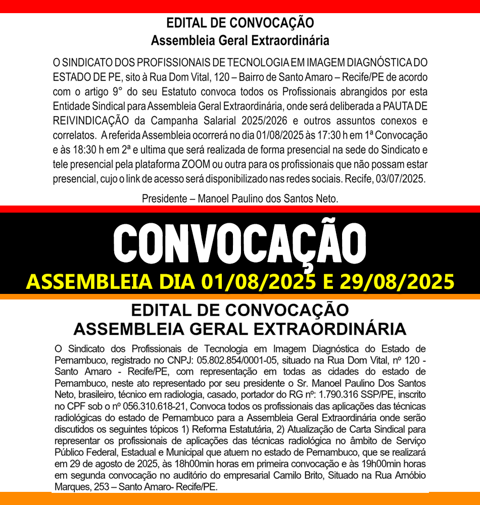 Sirvo-me do presente para convocar a todos os Tecnólogos, Técnicos e Auxiliares em Radiologia do estado Pernambuco, com fundamento no artigo 64º do Estatuto Sindical, para participar da Assembleia Geral Extraordinária no dia 28/12/2023...
